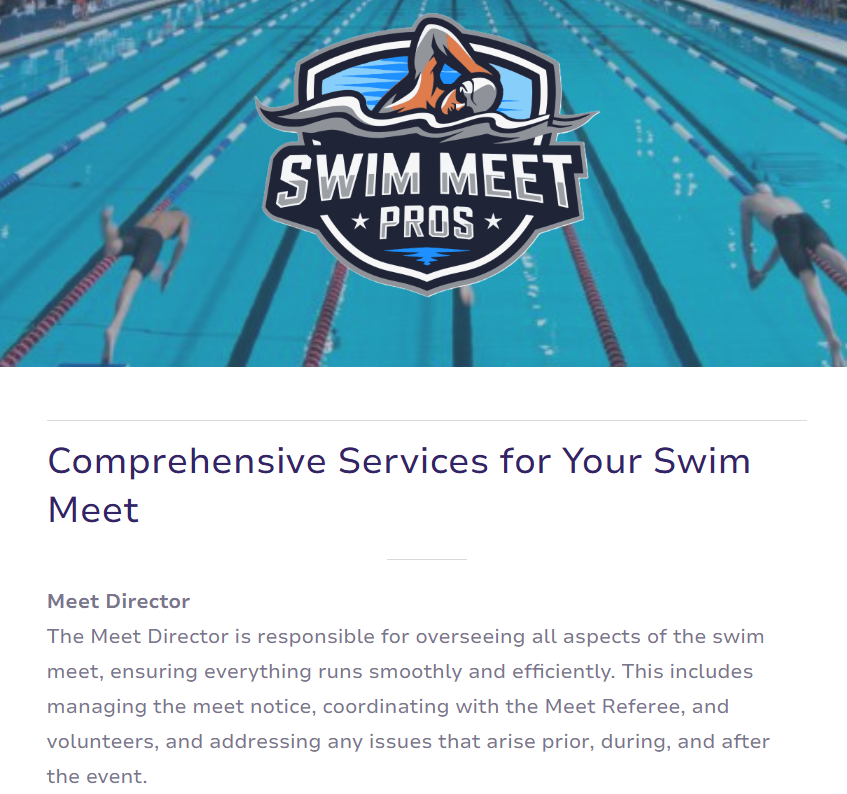 Swim Meet Pros offer a multitude of swim meet services, from Meet planning to in meet support. If you have a date and a facility, we can help you run your dream swim meet with our certified swim meet professionals staffing and services. You will know what your costs will be upfront for better financial planning and budgeting.